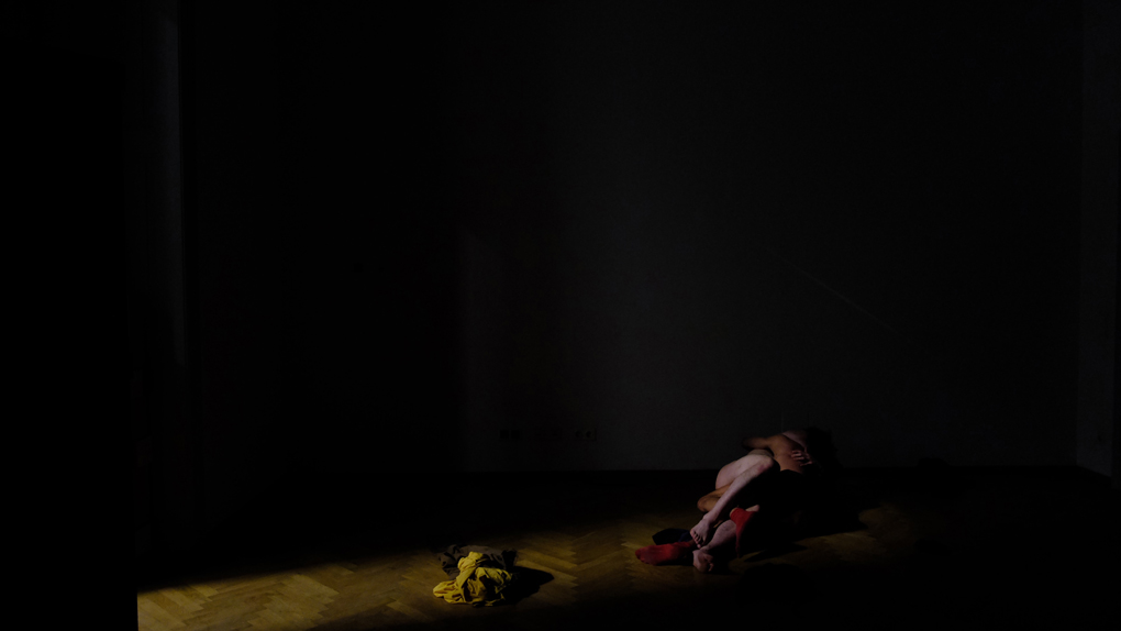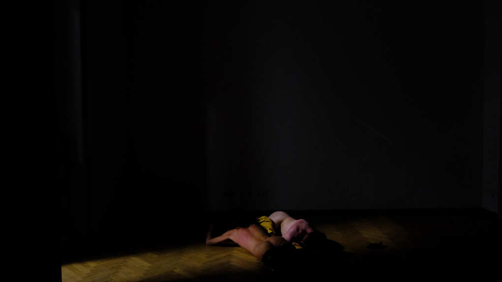 "Huldra (Leaving the Door Ajar)" takes its title from the Norwegian mythological figure of the same name. Huldra, originally meaning "the hidden one," appears in folkloric tales across the country - always sly, visible for barely a second their near - human form betrayed only by the telltale presence of a cow’s or fox’s tail. Often depicted naked in the woods, they seduce unsuspecting, lustful wanderers to bring them into her realm, the subterranean. This work seeks to encircle this subject: An exhibitionist who chooses to remain unseen. A ghostly presence inhabits a generic art space—perhaps a studio, a gallery, or a place of storage. The door remains slightly ajar; through its narrow aperture, a blade of light offers the camera the barest chance to register motion. Something—someone—passes, but remains unresolved.Their gestures resist interpretation: is this a struggle or an embrace? An invitation, or a warning? Have they infiltrated the institution—a museum, a gallery—or were they always part of its architecture, merely unacknowledged? These are no ordinary trespassers, but interlopers of attention: figures who haunt the peripheries of visibility, who crave the gaze even as they recoil from its fixity and capture.They do not steal objects, but moments. They do not want to own, but to be momentarily known—and then forgotten.Will they ever leave? Or is their exile precisely the point?