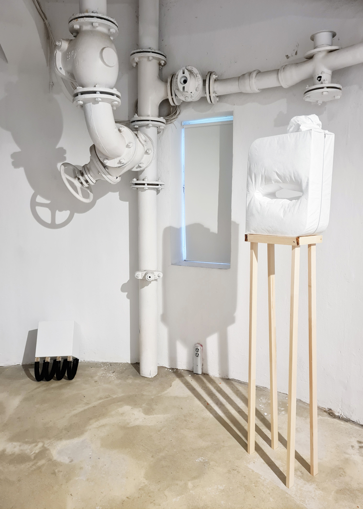 For the exhibition “Self-brainwashing” new white objects were developed from white protective suits. Michailov has been using these for many years in a performative way to leave as few traces as possible in given structures. In his search of who we are and what we are not, he now transforms them into new “therapy sculptures”, which are intended to break open habitual thought structures. Thus, among other things, discarded found objects from the street, things that you actually do not like anymore, were softly bedded in absorbent cotton and newly papered with a protective suit. This not only gives these things a new appreciation, even the hidden, no longer wanted gets new meaning and experiences can change. But at the same time this meaning is not yet defined. The newly created forms are subject to our own self-brainwashing. Not knowing what is hidden behind the sheathing, the viewer can give them a completely new perspective. New constructions and connections and even the unimaginable can be made possible.